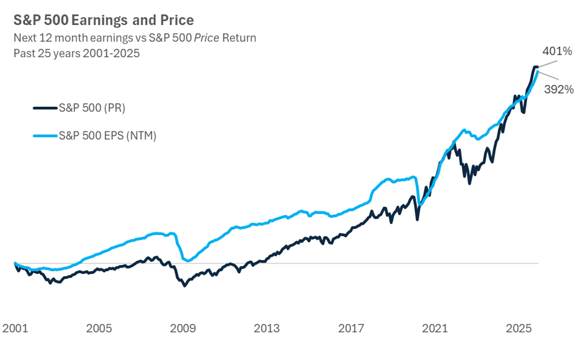 There are certainly ebbs and flows, times when the market gets ahead of itself and vice versa, but overall, the path of earnings and the path of stock prices align.
